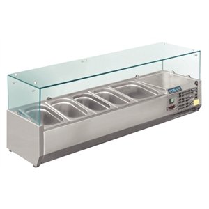 PRODUCT DESCRIPTIONS:Innovative and versatile countertop serving and prep unit. With glass surround. Capable of holding up to 100mm deep 1/3 and 1/2 GN containers.