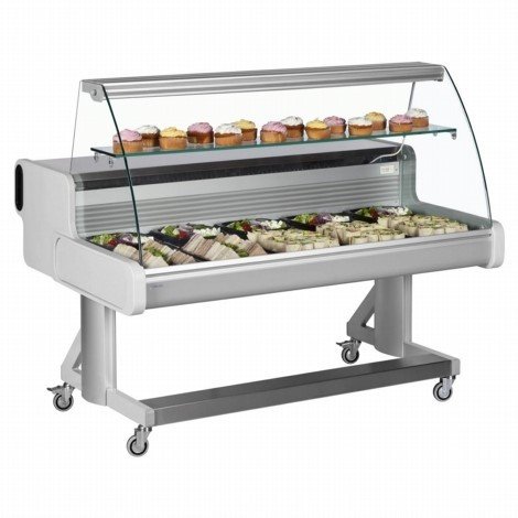 PRODUCT DESCRIPTIONS:A mobile serve over counter with a refrigerated deck and ambient shelf. Ideal for cafes and deli's. The air flow on the unit is designed so it does not need to be fan assisted and you will get even cooling over the whole deck without the problem of a fan drying out the food. An ambient shelf also gives you extra display space. The unit can also be taken off the trolley to allow to be counter mounted (please note if counter mounting you will need to cut a slot for the drip tray which is mounted in the middle at the back of the unit).