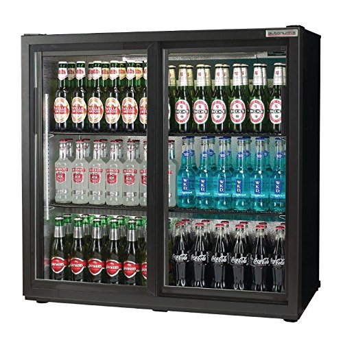 PRODUCT DESCRIPTIONS:With a huge 240 bottle capacity over two adjustable shelves, the black Autonumis Maxi double sliding door back bar bottle cooler is the ideal beer fridge for bars, pubs, clubs and restaurants. The attractive LED lighting and robust double glazed doors ensure beers, ciders and soft drinks are all appealingly merchandised. The Autonumis Maxi design is wider than standard double door beer fridges, meaning more bottles can be stored in its capacious interior. Useable capacity 252 litres.